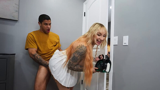 Young lover boy gets crazy about a blondie's pink bodysuit